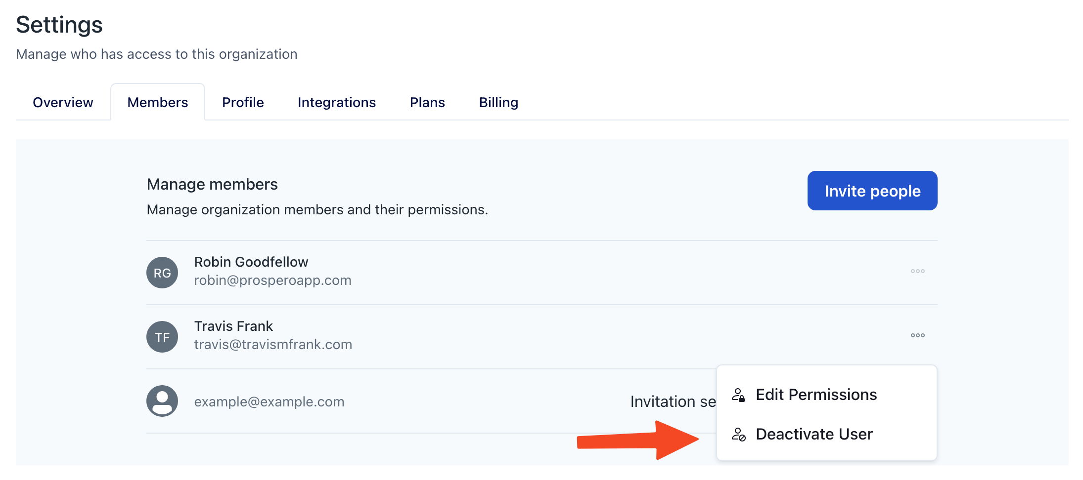 You can now invite other users to your organization! Head to Settings > Members and click Invite people. They'll get an email with a link to sign up and join your Prospero Organization. You can resend invitation emails or revoke invitations from the members tab.